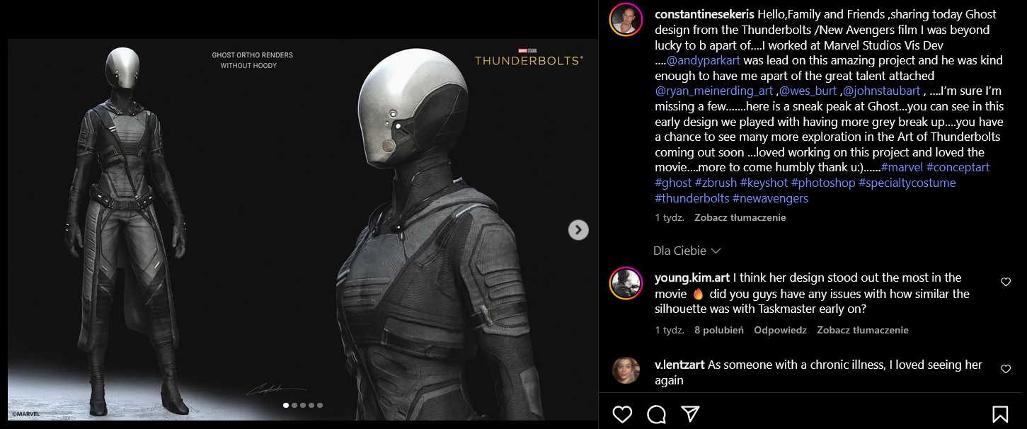 Na Instagramie Sekeris podzielił się kilkoma projektami, które prezentują bardziej segmentowaną, srebrno-szarą wersję zbroi Ghost i hełm o bardziej wyraźnych podziałach. „Bawiliśmy się rozkładem szarości i innymi wariantami” – napisał artysta, zapowiadając więcej materiałów w nadchodzącym albumie The Art of Thunderbolts.