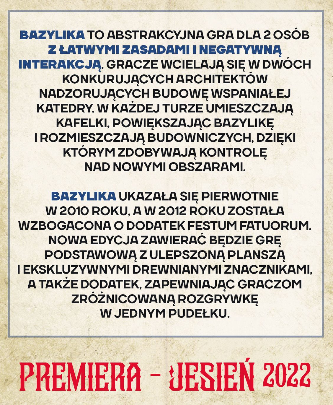 Portal Games przygotowuje grę planszową „Basilica”, skupioną na rywalizacji ambitnych architektów, projektujących i nadzorujących prace mające na celu powiększyć tytułową budowlę.