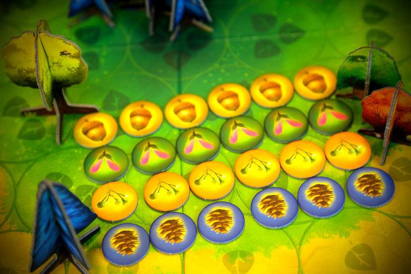 Każdy z was posiada 6 żetonów Nasion i 14 Drzew – 8 Małych, 4 Średnie i 2 Duże. Na początku gry większość z tych elementów umieszczacie na swoich planszach graczy (będziecie je musieli dopiero odblokować), z kolei 2 Nasiona, 4 Małe i 1 Średnie drzewo kładziecie obok plansz — z tych elementów będziecie mogli od razu korzystać. Na środku stołu połóżcie planszę główną oraz kafelek Słońca w widocznym, nadrukowanym na planszy miejscu. Na koniec każdy z was umieszcza po 2 Małe drzewa na wybranych, zewnętrznych polach planszy głównej. Możecie zaczynać grę!