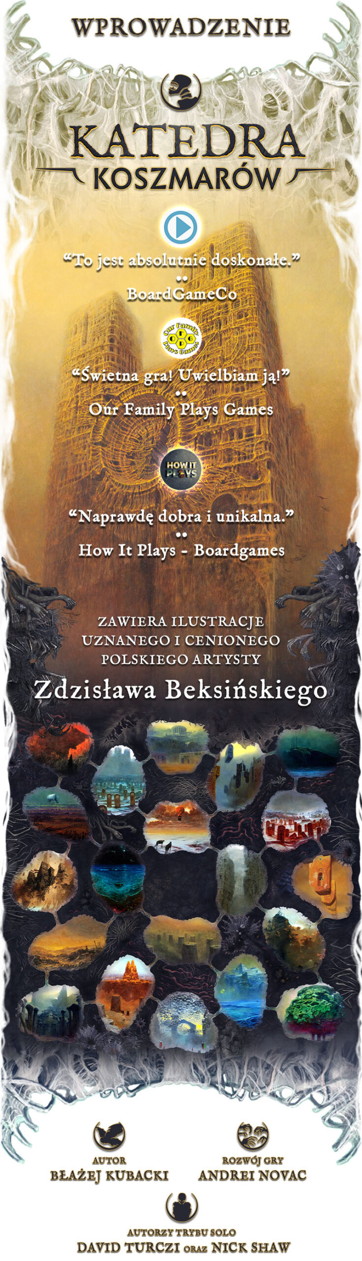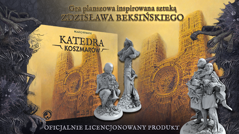 Zdzisław Beksiński to jeden z najbardziej rozpoznawalnych i cenionych polskich malarzy wszech czasów, a jego obrazy stały się inspiracją dla Błażeja Kubackiego, który stworzył grę planszową przesiąkniętą oryginalnymi wizjami i barwnymi pejzażami, jakie wyszły spod ręki tego cenionego artysty. Nie tylko pełny zestaw grafik “Katedry Koszmarów” opiera się wyłącznie na jego pracach, ale cały mechanizm gry jest bezpośrednim wynikiem interpretacji sztuki artysty.
