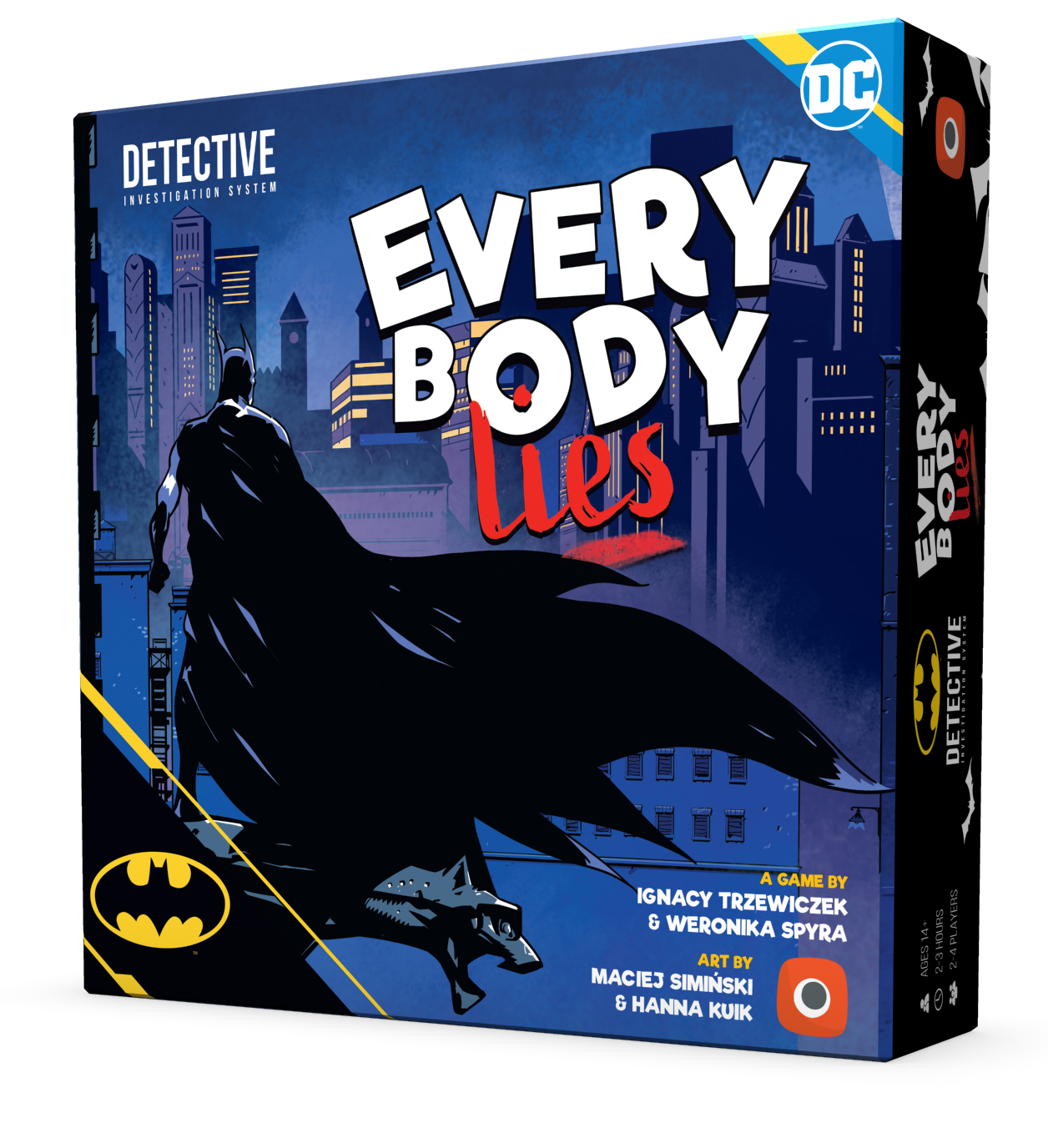Batman: Everybody Lies to kooperacyjna gra narracyjna dla 2-4 graczy, bazująca na systemie znanym z bestsellerowej gry Detektyw: Kryminalna Gra Planszowa. Autorami gry są Ignacy Trzewiczek i Weronika Spyra, a za ilustracje, dzięki którym przeniesiecie się wprost do świata znanego wam z komiksów, odpowiedzialni są Hanna Kuik i Maciej Simiński. W Everybody Lies każdy z graczy wciela się w rolę jednej z czterech postaci: doświadczonego dziennikarza śledczego Warrena Spaceya, nieustępliwej reporterki Vicki Vale™, nieprzebierającego w słowach policjanta Harveya Bullocka, lub przebiegłej włamywaczki Seliny Kyle, znanej także jako Catwoman™. Poznając Gotham z ich perspektywy, odwiedzicie między innymi takie lokacje jak Arkham Asylum™, Więzienie Blackgate, a nawet Batcave™. Aby rozwiązać cztery unikatowe śledztwa, będziecie musieli działać wspólnie. Nie zmarnujecie jednak okazji, by w międzyczasie osiągnąć własne cele…