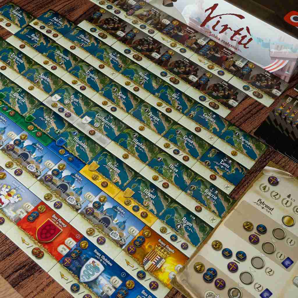 Przystępując do gry w Virtu, staniecie na czele jednej z pięciu potężnych dynastii: Aragonów z Neapolu, Sforzów z Mediolanu, Medyceuszy z Florencji, Dożów z Wenecji albo Borgiów z Rzymu. Waszym nadrzędnym celem stanie się posiadanie jak największej liczby Punktów Prestiżu, które będziecie zdobywać kolejno za: kontrolowane Miasta, postępowanie na torze Patronatu, poziom Wpływów Religijnych, zdobyte Trofea Wojskowe, Sojusze polityczne z wielkimi mocarstwami (Królestwo Francji, Imperium Osmańskie, Świętej Cesarstwo Rzymskie) oraz działanie niektórych kart i kafelków.