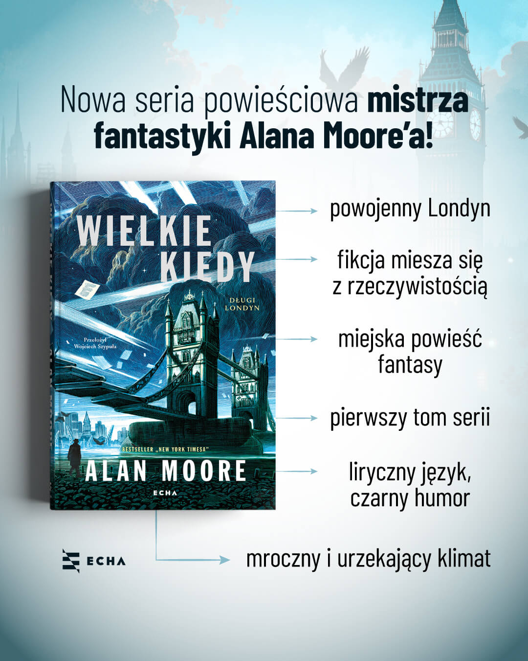 „Wielkie Kiedy. Długi Londyn” to nowa, wyczekiwana powieść Alana Moore’a, mistrza literackiej fantastyki i twórcy „Strażników” czy „V jak Vendetta”. Książka ukaże się 21 maja i otwiera pięciotomowy cykl zatytułowany „Długi Londyn”, który ma doczekać się również adaptacji serialowej.