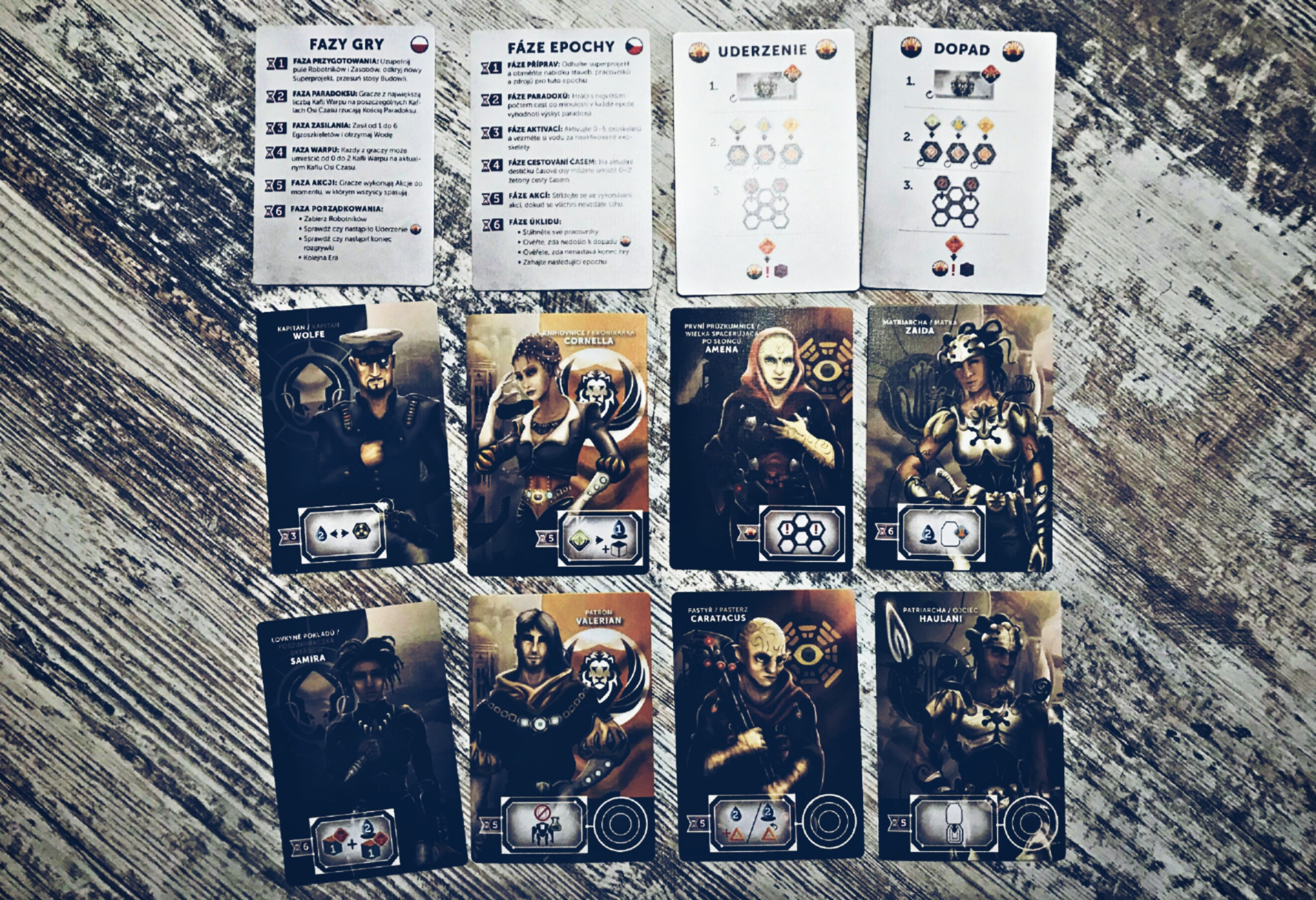 Skąd źródło takich zalet projektu? Wystarczy spojrzeć na pudełko i odpowiedź przychodzi sama. Za tytuł odpowiada zespół trzech młodych, ale doświadczonych i obeznanych z rynkiem gier bez prądu projektantów. Na przód wysuwa się nazwisko DávidaTurcziego, człowieka dzięki któremu światło dzienne ujrzały świetna „Aura”, „DiceSettlers”, „Days of Ire: Budapest 1956” czy „Cerebria: The Inside World”, no i przede wszystkim twórcę ambitnego, mającego w drodze do wydania już kilka następnych projektów oraz parę na warsztacie. Viktor Peter też nie narzeka na brak pracy, czego dowodem portfolio, na którym nie zabrakło obłędnego wizualnie „Trickerion: Dahlgaard’sGifts” czy „Cerebria: The Inside World”, obecnie działającego m.in. przy „Perseverance: CastawayChronicles”. Ostatni, Richard Amann – mocno związany z pozostałą dwójką – może pochwalić się i „Trickerion: Dahlgaard’sGifts”, i „Cerebria: The Inside World”, i nadchodzącym „Transhumanity”. Spójność reguł, kompozycji i tematu w „Anachrony” pozwala zakładać, że gra zespołowa w tym składzie to dla każdego z nich gratka.