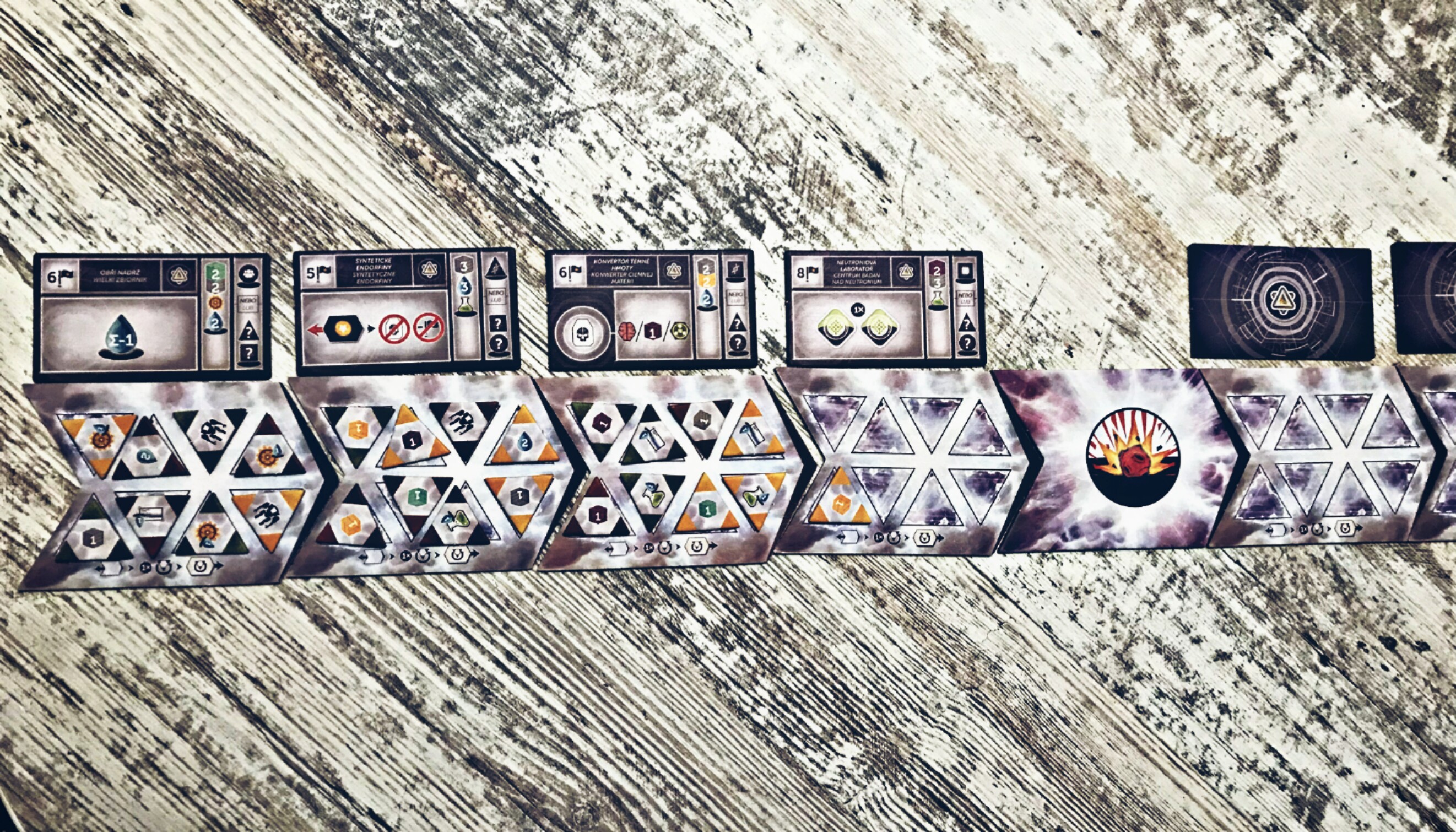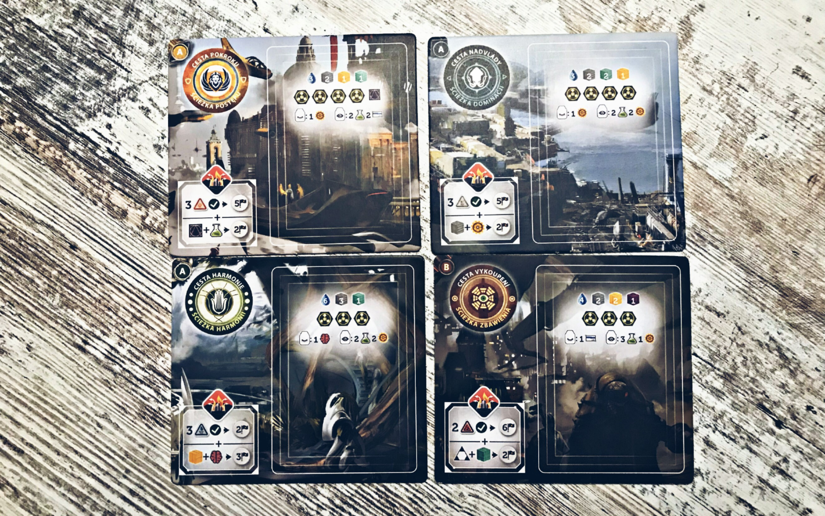 A jak w to grać? W sumie gra składa się z siedmiu rund (w założeniu) – symbolizowanych przez odpowiednie kafle toru czasu – poprzetykanych czymś na zasadzie tur graczów, i to właśnie one będą zajmować największą część rozgrywki. Polegają one na punktach akcji silnie powiązanych z zarządzaniem robotnikami (bo to nasz „odnawialny surowiec” za sprawą którego czegokolwiek możemy dokonać), no i oczywiście posiadanych zasobach ekonomicznych (m.in. energii, wodzie). W (umownych) punkach akcji gracze mogą wznosić budynki, realizować superprojekty, konstruować wynalazki, prowadzić doświadczenia, pozyskiwać wodę, podnosić morale, utrzymywać życie czy zdobywać dominację – wszelkie działania mają znaczenie na koniec partii i wpływają na ostateczną ilość punktów, a co za tym idzie: wskażą frakcję, która poprowadzi ludzkość w przyszłości. Gra dobiega zaś końca albo po ukończeniu wszystkich etapów (siedem rund) albo zajęciu pól aktywności w mieście.