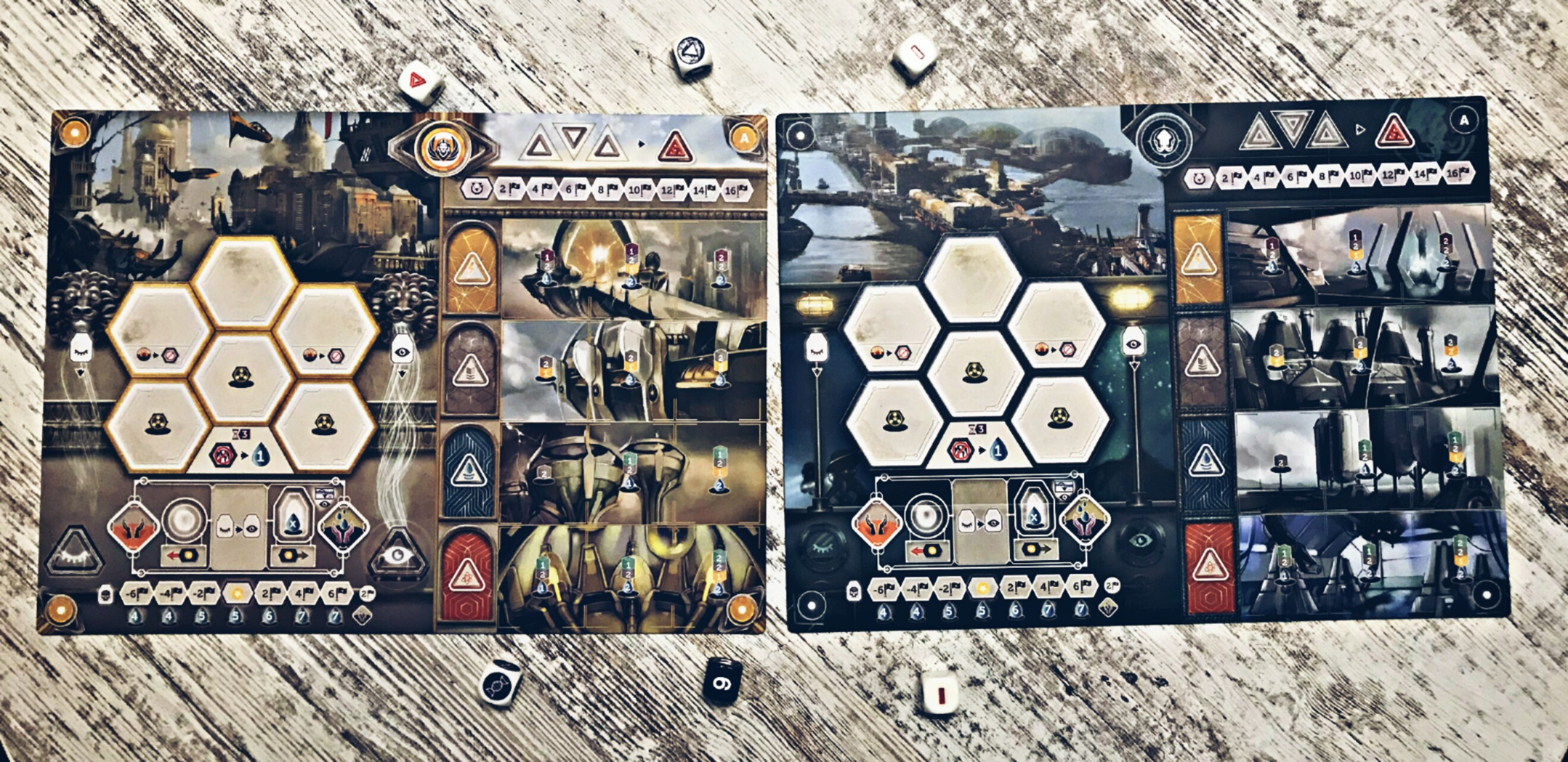 Narzekać nie można też na wykonanie. Całość utrzymana jest w surowej, lekko retro science fiction estetyce (subtelne nawiązanie do „Blade Runnera” na miejscu), która pozytywnie podbudowuje klimat i odzwierciedla charakter miejsc, bohaterów czy znaczników (logafrakcji choć aż tak nie identyfikują ich z ideologią, są ciekawe i łatwe do rozróżnienia), żetony z surowcami co prawda nie wyróżniają się szczególnie, lecz nie oszpecają pozostałych elementów. Jakość wykonania i materiału nie budzi zastrzeżeń, solidne plansze i karty są nawet mocniejsze od wysokich standardów polskiego rynku, z kolei dobre uszlachetnienie kart sprawia, że są odporne na drobne przetarcia i mniejsze uszkodzenia. Kształt komponentów z kolei okazuje się pomocny i w dalszych etapach rozgrywki (w momencie rozlokowana żetonów czy znaczników na planszach) imituje panele zarządzania z wizji sztuk wizualnych, poświęconych futuryzmowi.