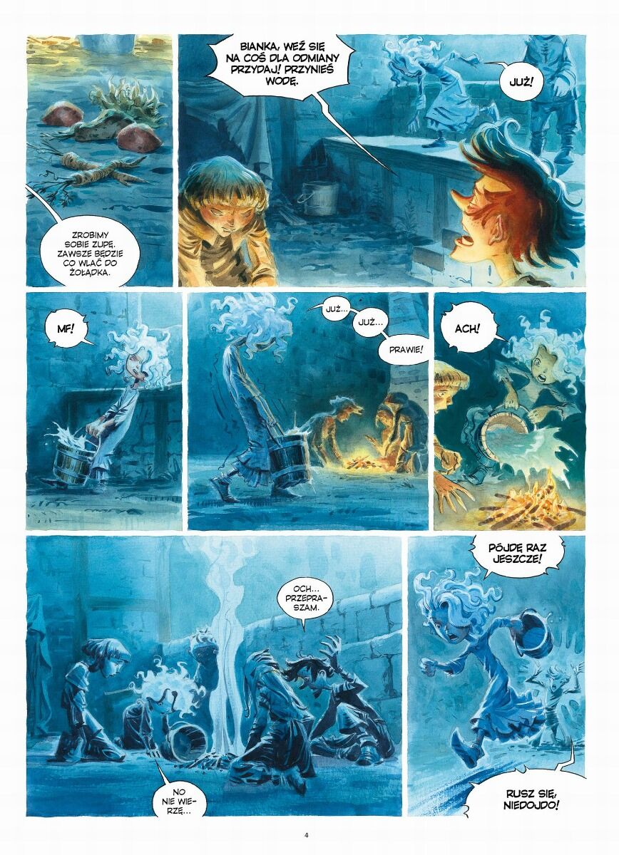 W centrum opowieści stoi Bianka, najbardziej przytomna i odważna z porwanej grupy. Dziewczynka przetrwała już wiele, lecz dopiero w ogrzej kuchni musi wykazać się prawdziwą pomysłowością. Próba ratowania przyjaciół prowadzi ją przez kolejne poziomy tej niezwykłej przestrzeni, od miejsc przygotowywania potraw po zakamarki, gdzie trafiają resztki i zapomniane elementy wielkiej gastronomicznej machiny. Historia bardzo świadomie korzysta z motywów klasycznej baśni o dziecku rzuconym w świat niebezpieczeństw, lecz zamiast lasu czy chatki wiedźmy pojawia się tu groteskowa i jednocześnie fascynująca architektura kulinarnego imperium ogrów.