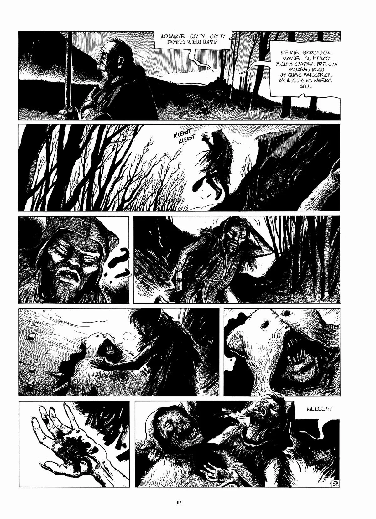 Dużą rolę odgrywa również warstwa graficzna. Hubert Czajkowski zdecydował się na czarno-białą stylistykę, która idealnie pasuje do tonu historii. Mocny kontrast światła i cienia nie tylko buduje atmosferę, ale też podkreśla brutalność przedstawionego świata. Surowa kreska sprawia, że średniowiecze nie wygląda tu jak romantyczna legenda, lecz jak miejsce twarde i niebezpieczne.