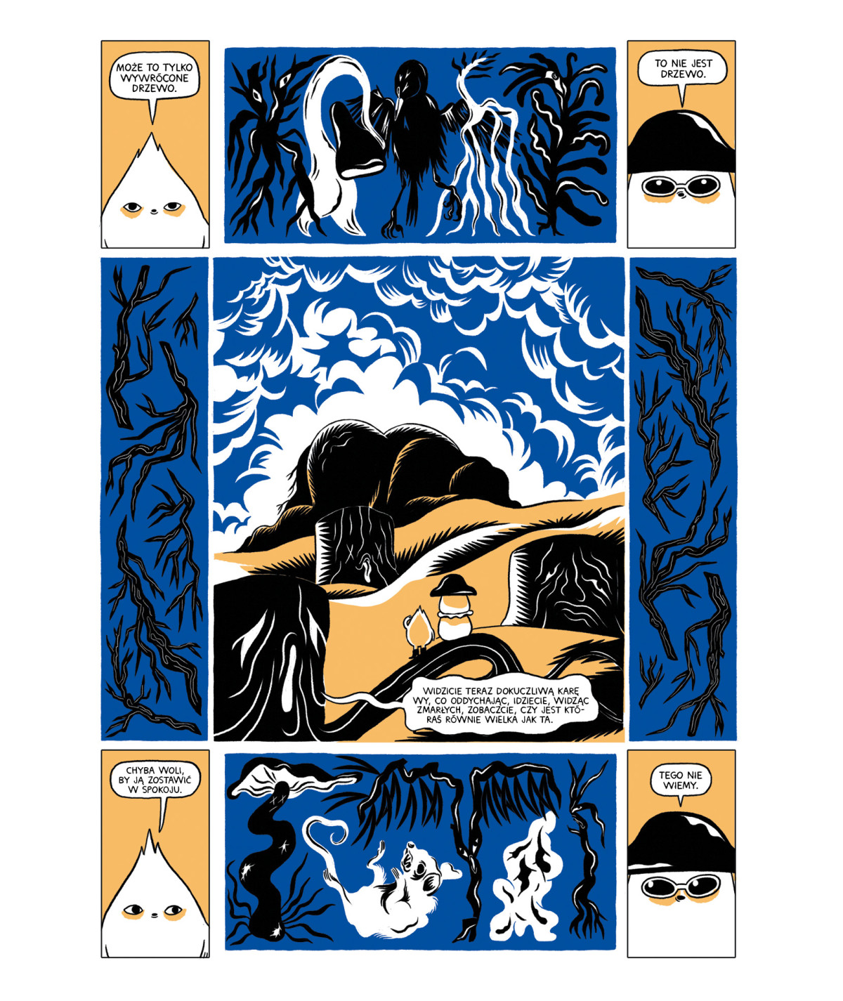 Wizualnie komiks potrafi zahipnotyzować. Donner pracuje ograniczoną paletą i robi z niej pełnoprawny język. Plansze bywają gęste, czasem niemal ornamentalne, a jednocześnie bohaterowie są rysowani prostą, umowną kreską, która świetnie kontrastuje z wielkością i tajemnicą lasu. Ta estetyka ma w sobie coś znajomego, kojarzy się z baśniową miękkością, ale równocześnie potrafi zbudować niepokój, kiedy cień drzewa zaczyna wyglądać jak ściana, a ścieżka jak pułapka. To komiks, który pięknie udaje łagodność, żeby tym mocniej uderzyć w momentach, gdy odsłania swój mrok.