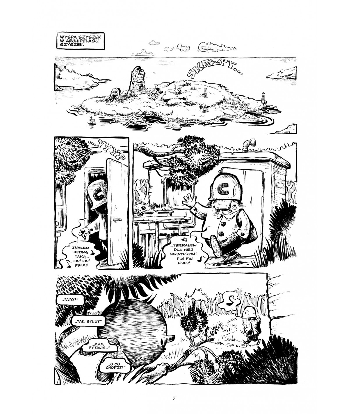 Sam motyw Strażników Szyszek jest znakomity, bo na pierwszy rzut oka wydaje się żartem. Czym właściwie zajmuje się ktoś, kto pilnuje szyszek. Po co taka funkcja. Dlaczego miałaby być ważna. I właśnie z tego pozornego nonsensu wyrasta jedna z najciekawszych myśli całego komiksu. Wspólnota nie opiera się wyłącznie na tym, co spektakularne, oczywiste i łatwo mierzalne. Czasem najistotniejsze są role, których sens rozumie się dopiero wtedy, gdy zacznie ich brakować. Szulc bardzo sprytnie buduje z tego metaforę użyteczności, odpowiedzialności i miejsca jednostki w większym porządku. Nie robi tego jednak ciężką ręką. Nie zamienia komiksu w przypowieść, którą trzeba odczytywać jak obowiązkową szkolną lekcję. Pozwala, żeby znaczenia wypływały z przygody, humoru i kolejnych spotkań z mieszkańcami archipelagu.