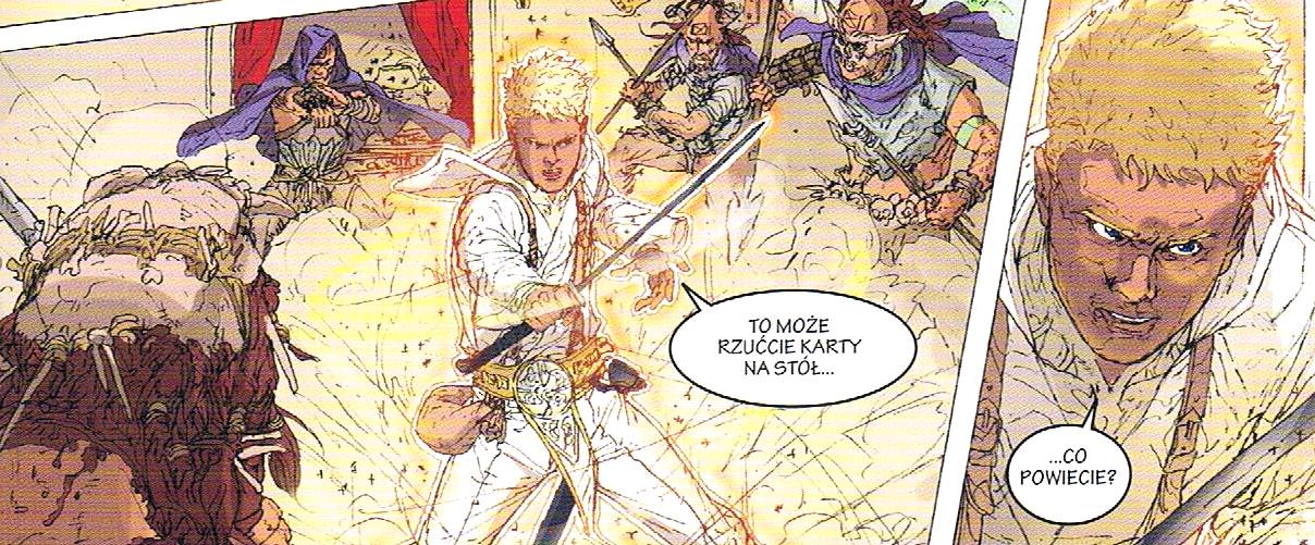 Przede wszystkim drugi tom „Białego Piasku” to tom pośredni. I to tak typowo. Niby do czegoś prowadzi, coś tam uzupełnia, wyjaśnia funkcjonowanie niektórych aspektów świata, ale fabuła praktycznie stoi w miejscu. Jest trochę akcji, przekomarzania, poznania bohaterów – z tym, że mało co z tego służy fabule, większość właściwie to furtki dla bocznych wątków. Czy zbędnych? Następny tom być może pokaże. Na razie nie zawsze potrzebnych.