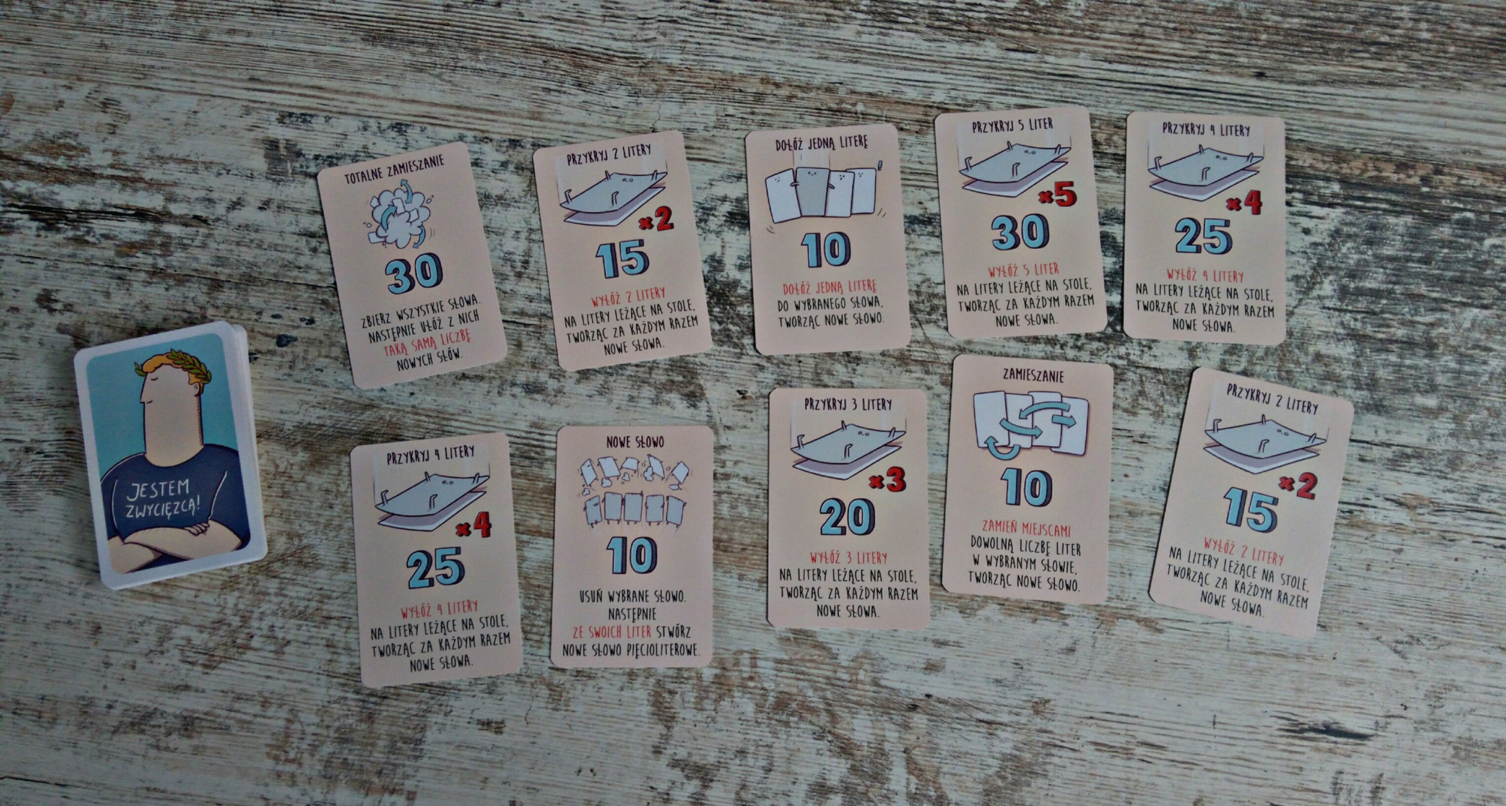 Grze Annie Whiteheada i Matta Knotta odmówić za to nie można pięknego wykonania. Opatrzone wesołymi literami karty – praca Pawła Jarońskiego – prezentują się godnie, są miłe dla oka i zostały wykonane z dobrej jakości papieru, dzięki czemu nie powinny tak szybko się niszczyć czy przecierać. Grafiki są plastyczne, nieformalne i czasem nawiązują do popkultury – skoro zabawa, to nie ma co się bać motywów komicznych (tu brawa). Poręczne pudełko to także nie takie standardowe opakowanie do przechowywania kart. Plastykowa wypraska z miejscami na dwie talie jest przeźroczysta, a pod nią, na całej dolnej, wewnętrznej części pudełka znajduje się grafika z rozsypanymi, pomieszanymi literkami – tworzy to spójny estetycznie efekt. Wykonanie więc stoi na wysokim poziomie i nie ma praktycznie żadnych wad.