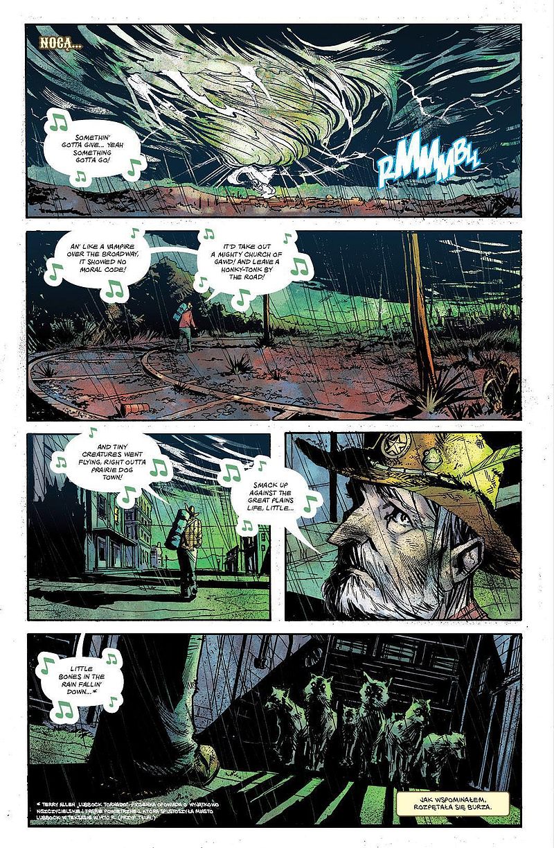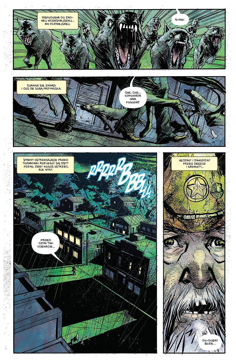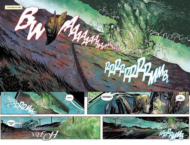 Graficznie mam jedynie problem z „God Country”. Nie ma żadnej tragedii, ilustracje zgrabnie działają w opowiadaniu tej historii. Są wystarczająco ekspresywne, czasem niewyraźne celowo, a rzadziej zupełnie niepotrzebnie. Niektóre sceny Geoff Shaw szkicował jakby od niechcenia, niechlujnie i mało wyraziście, ale zdarzają się u niego bardzo dobre momenty. Jednak w porównaniu z tym, co czyni Cates scenariuszowo, warstwa obrazowa wypada tylko poprawnie.
