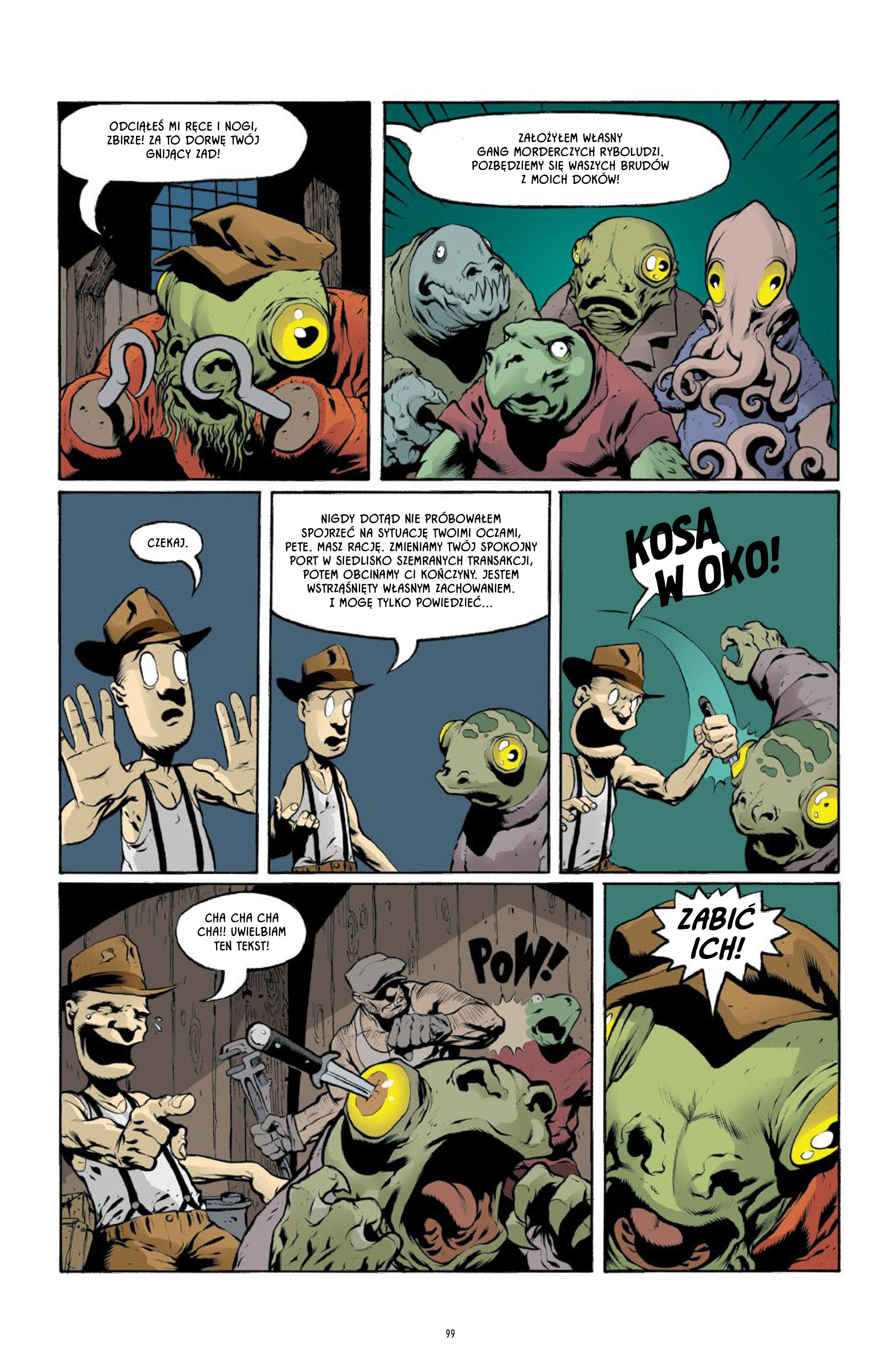 Zniewieściałe wampiry, niezaspokojony podwodny potwór, pająk – hazardzista z zaległymi alimentami – ogromna zombie-małpa, potępiony szeryf, święty Mikołaj, foka-jasnowidzka, szalony naukowiec… to tylko kilka barwnych postaci przewijających się przez przygody dwójki głównych bohaterów, czasem stanowiąc tylko niezbędny element do popchnięcia fabuły, a innym razem zyskują całkiem nowego, głębszego znaczenia, wywracając do góry nogami dotychczasowy punkt widzenia czytelnika. Eric Powell stworzył dzieło, w którym zdaje się mógłby umieścić dosłownie każdego bohatera kiedykolwiek wymyślonego przez kogokolwiek, i nie byłaby on nie na miejscu. To w główniej mierze dzięki temu, gościnna obecność Hellboya (najsłynniejszego dziecka Mike’a Mignoli) nie jest tu niczym dziwnym, idealnie wpasował się on do świata Zbira, jak gdyby od zawsze w nim egzystował.