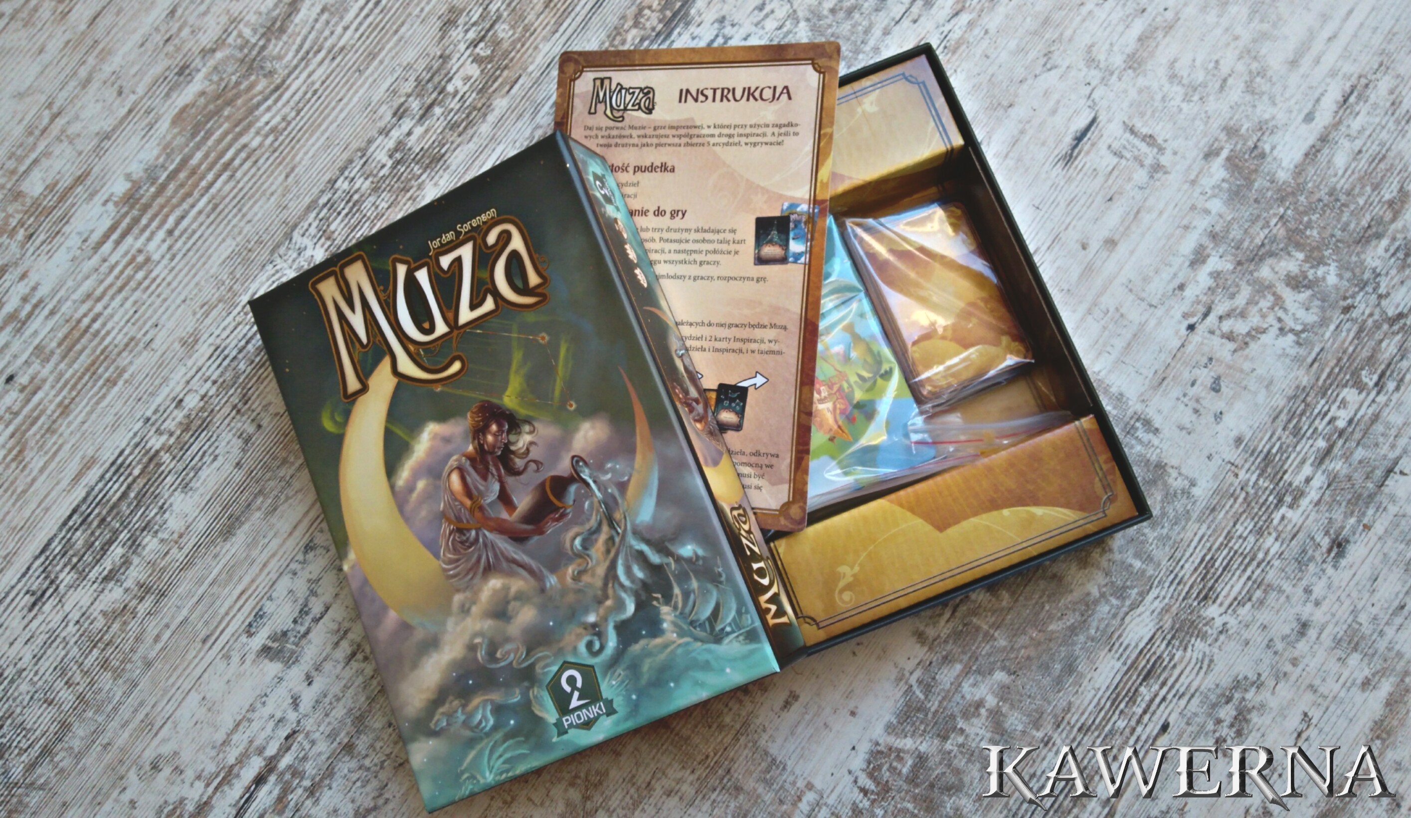 Jeżeli na waszych stołach regularnie gości „Tajemnicze domostwo”, „Dixit”, „Kraina snów” czy „Cienie Amsterdamu” to znak, że jesteście miłośnikami abstrakcyjnych rozgrywek z wykorzystaniem wspaniałych ilustracji. Teraz do grona tych mimo wszystko różnorodnych tytułów możecie dodać kolejną grę idealną do rozpoczęcia planszowego wieczoru lub wprowadzenia nowych współgraczy do świata zabaw opartych na wyobraźni i intuicji. „Muza” bowiem to tytuł bardzo lekki, szybki, a przy tym wnoszący delikatny powiew świeżości, wynikający z połączenia bogato ilustrowanych kart z kartami zawierającymi polecenia w stylu „zanuć melodię” lub „podaj tytuł książki”, aby naprowadzić swoją drużynę na odpowiednie rozwiązanie.