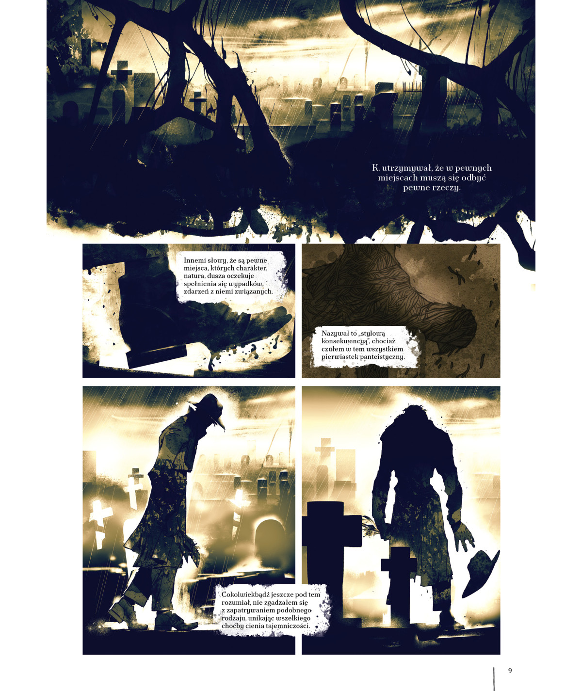 Błonia tajemnicy to więcej niż adaptacja: to przywołanie ducha autora, który całe życie patrzył w mrok i uczył się jego alfabetu. Stefan Grabiński, nazywany polskim Lovecraftem, odnalazł w końcu medium, które mówi jego językiem: obrazem, rytmem kadru, kolorem, który dusi lub rozświetla zło. Ta antologia to estetyczna i emocjonalna seansa spirytystyczna, w której pięciu rysowników i jeden scenarzysta przywracają do życia pięć najbardziej niepokojących opowieści polskiego Samotnika ze Lwowa.