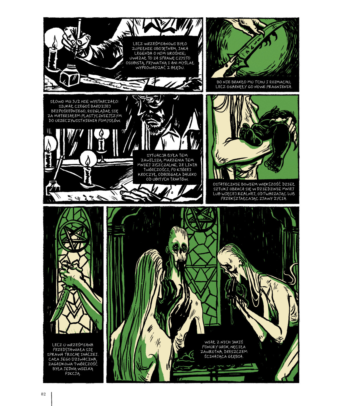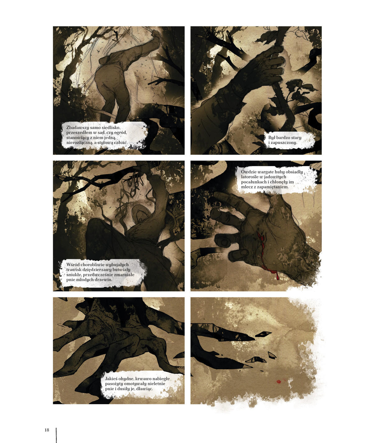 Mateusz Wiśniewski, autor scenariuszy, zachował w adaptacjach styl i strukturę prozy Grabińskiego. Nie upraszcza, nie wygładza, nie modernizuje. Zamiast tego konstruuje komiksowy labirynt, w którym słowo i obraz prowadzą czytelnika ku temu, co nieznane i obce, ale dziwnie znajome. Szalona zagroda, Czad, Smoluch, Dziedzina i Spojrzenie: każdy tytuł to nie tylko opowieść, ale inny wymiar strachu, inny sposób na pokazanie, jak kruche są granice między światem żywych a tamtym.