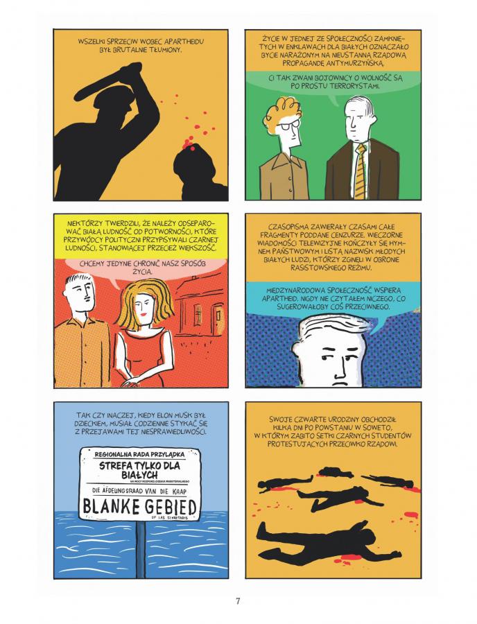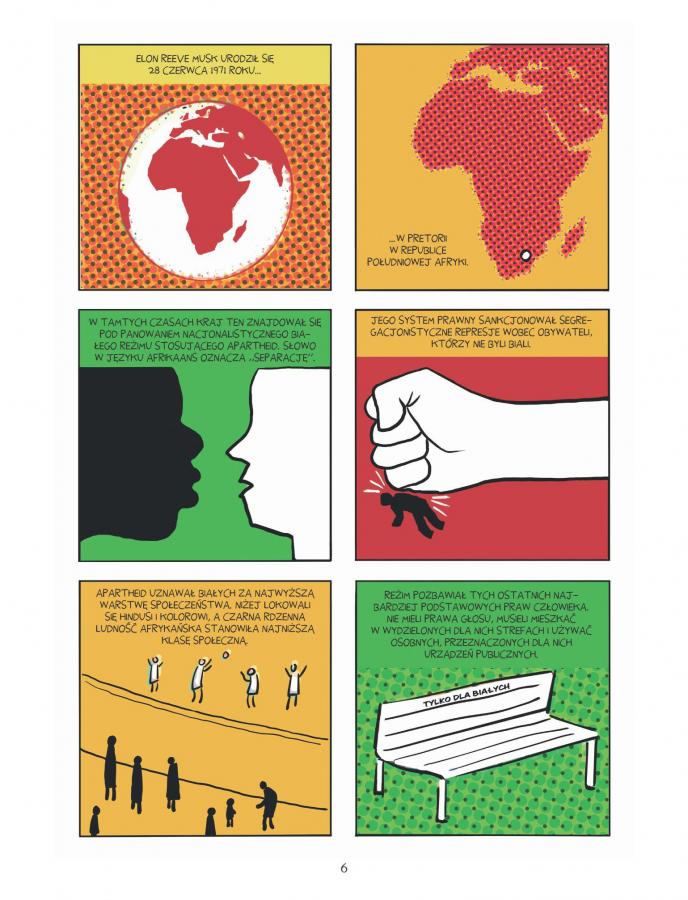 Choć forma sugeruje lekką opowieść, mamy przecież komiks, to w środku znajdziesz bardziej dokument niż narrację. Cunningham prowadzi chronologicznie przez kolejne etapy życia Muska: od dzieciństwa w RPA, przez Dolinę Krzemową i kolejne technologiczne imperia, aż po zakup Twittera i wizje przyszłości rodem z powieści sci-fi. Tekstu jest dużo, ilustracje są uproszczone i dość statyczne, często tylko komentują treść lub nadają jej ironiczny wydźwięk.