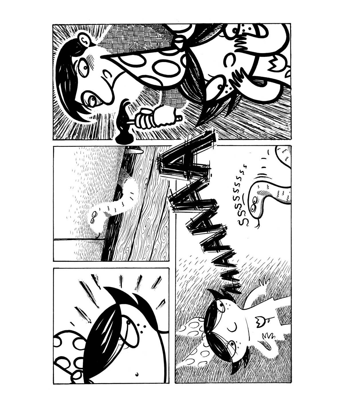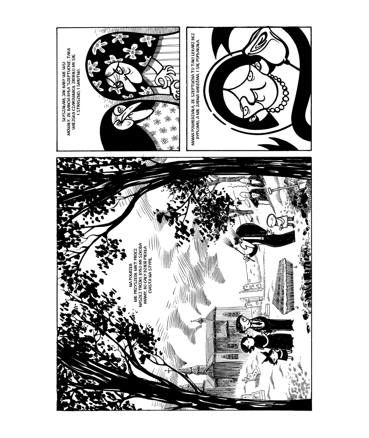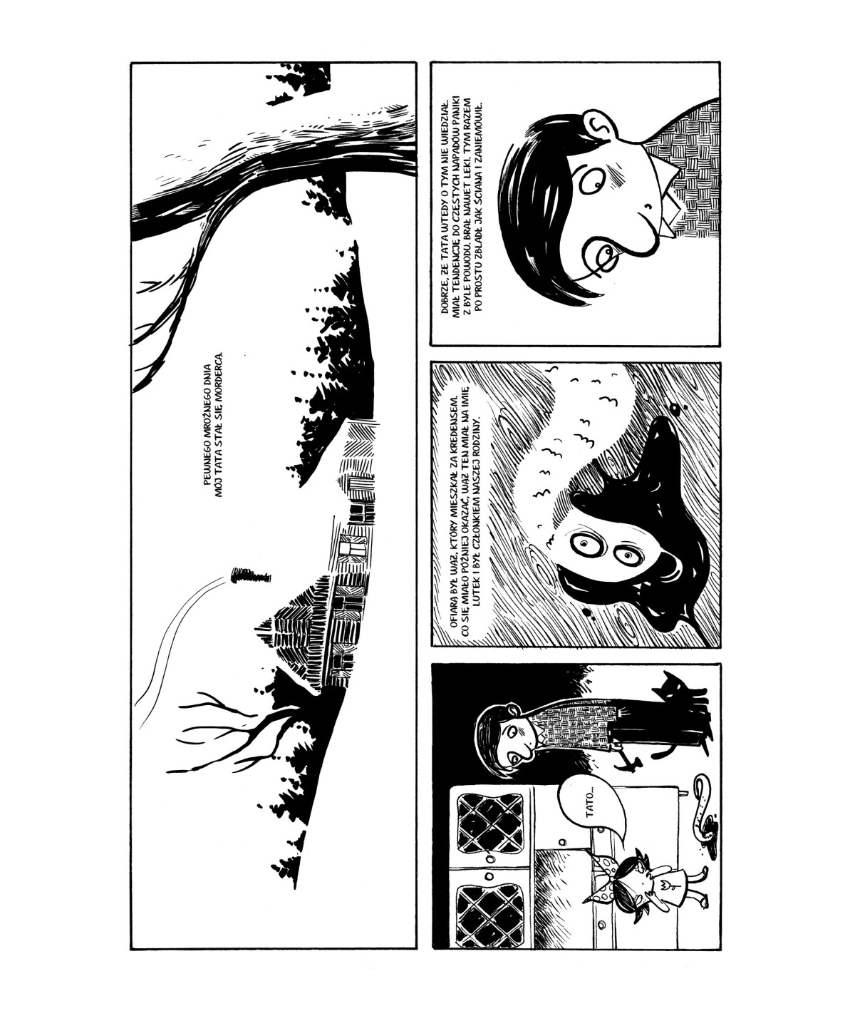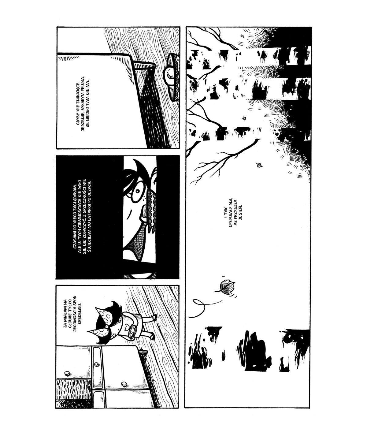 Rysunki Kalinowskiego są czarno-białe, kreskówkowe, ale do bólu sugestywne. Kadry bywają proste, czasem oszczędne, ale nigdy przypadkowe. Świat Łaumy to przestrzeń, w której kreska i cisza opowiadają równie dużo, co słowo. Groza nie wynika tu z przerysowania – tylko z napięcia między tym, co niewidoczne a tym, co właśnie się wyłania.