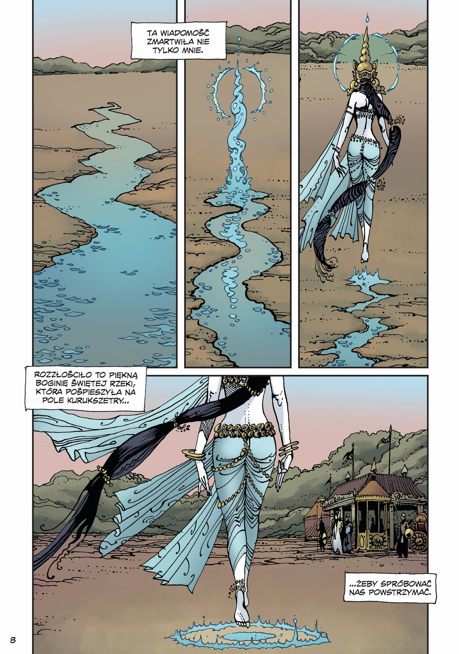Barańko nie opowiada Mahabharaty dosłownie. On ją interpretuje, filtruje przez siebie, szatkuje narracyjnie i graficznie. Jego styl nie przypomina żadnego innego współczesnego komiksu. To bardziej ilustrowana mantra niż opowieść akcji. Kadry często są symboliczne, bardziej jak malowidła świątynne niż ilustracje komiksowe. Kolory pulsują, sceny płyną od wizji do rzeczywistości bez ostrych przejść. Niektórych może to zmęczyć, bo tu nie ma „filmowej” narracji, nie ma linearnego prowadzenia. Ale jeśli czytelnik da się poprowadzić, wejdzie w rytm opowieści, to trudno się oderwać.