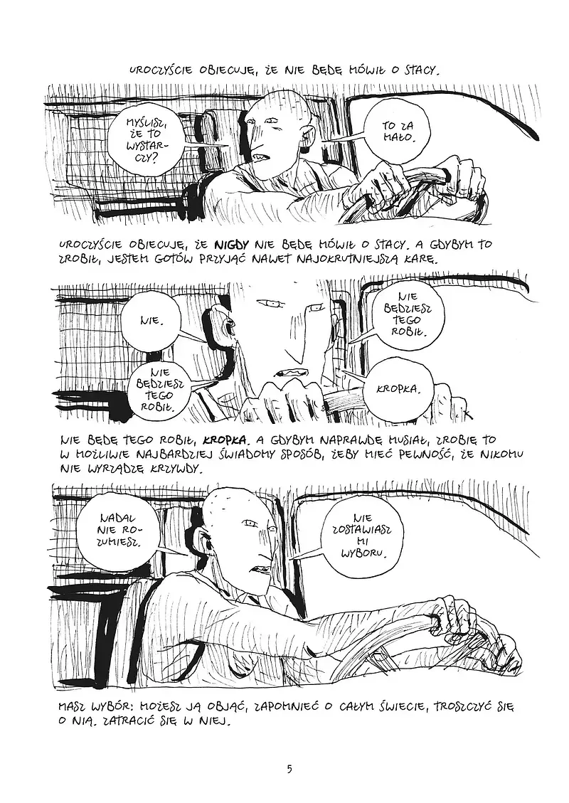 Narracyjnie Stacy to dzieło duszne i klaustrofobiczne. Osiem ciasnych kadrów na stronę, obsesyjna rytmiczność, niemal całkowity brak barw. W tej formule nie ma miejsca na oddech. Każdy panel to albo monolog, albo zbliżenie na pogrążonego w destrukcji bohatera, który dryfuje po własnej głowie jak po zalanej piwnicy. Gipi konsekwentnie odbiera czytelnikowi komfort i nie jest to zabieg estetyczny, lecz świadome podważenie konwencji empatii. Stacy nie ma nam się podobać. Ma nas uwierać.