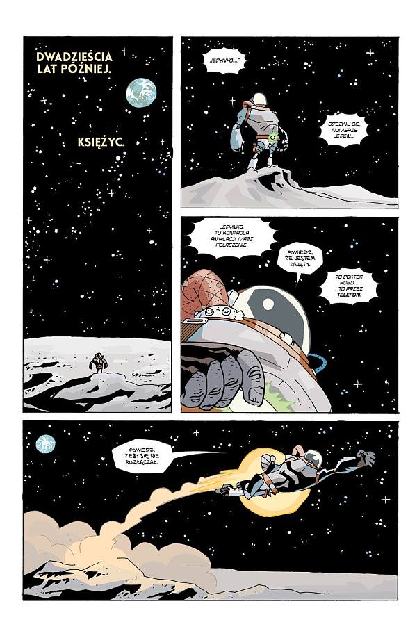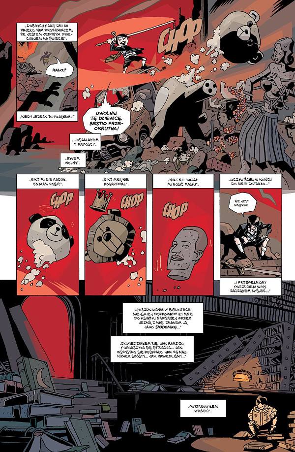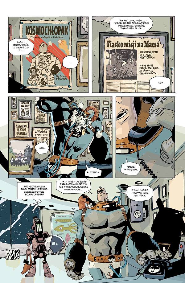 Niewybredny humor, ogromne ośmiornice, mordercze roboty, inteligentne małpy czy iście krwawe sceny to tylko wycinek niezwykłych elementów obecnych w „Suitcie Apokaliptycznej”, a kolejne zeszyty historii zapewne nie zwolnią ani tempa akcji, ani szaleństwa. Rysownik na bazie szkiców autora stworzył postacie całkowicie w swoim nieszablonowym stylu przywodzącym na myśl prace Mike’a Mignoli osadzone w kreskówkowym świecie. I chociaż wielokrotnie bohaterowie są bardzo mocno uproszczeni czy wręcz przerysowani, to niejeden kadr może poszczycić się mnogością szczegółów, zarówno na pierwszym planie, jak i w tle. Co by nie było, sama kreska nie wystarczy do zbudowania klimatu opowieści, na całe szczęście Dave Stewart odpowiedzialny za kolory odwalił kawał dobrej roboty, gdyż świetnie wkomponowują się one w specyficzność fabuły i nastrój konkretnej sceny. Dodatkowym wizualnym atutem z pewnością są dołączone okładki konkretnych zeszytów autorstwa wielokrotnie nagradzanego Jamesa Jeana, które zachwycają swoim charakterem, aurą i swoistą poetycznością.