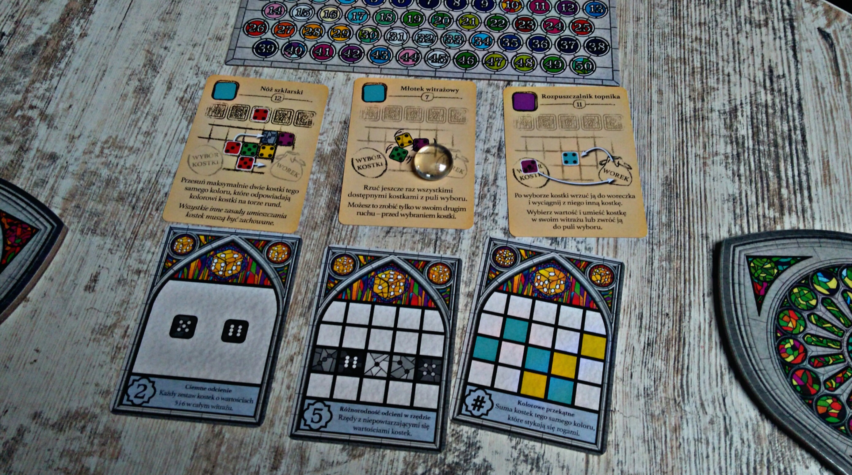 Nim dotrze się do tych miłych dla oka kompozycji, trzeba rozegrać kilka rund. Przygotowanie i przebieg rozgrywki nie należą do trudnych, a ilość zasad do spamiętanie nikogo nie powinna zniechęcić. Wybiera się witraż i wzór (na nim będzie określona ilość dostępnych dla danego gracza znaczników uznania oraz zaznaczone pola, gdzie można wyłożyć wyłącznie taki kolor albo wartość w kościach, jaki jest nadrukowany). Losuje indywidualny cel, trzy wspólne cele i trzy wspólne narzędzia (one zostają aktywowane, gdy ktoś wykorzysta znacznik uznania). Po wyborze pierwszego gracza (ten będzie się zmieniał co rundę), wrzuca się wszystkie kości do woreczka i z niego rozpoczynający gracz losuje dwie kości na jednego gracza w partii plus jedną (liczba graczów x2k + 1k), wybiera jedną, następny też jedną, a końcowy dwie i kolejka nie wraca do początkowego, tylko do trzeciego/drugiego w kolejności i ostatecznie do pierwszego (gracze – ABCD: A 1k -> B 1k -> C 1k -> D 2k -> C 1k -> B 1k -> A 1k). Gracz, który rozpoczął na koniec rundy powinien mieć do wyboru dwie kości, jedną dobiera sobie, a ta, co została ląduje na torze rund, gdy ten się zapełni gra się kończy i podlicza się punkty.