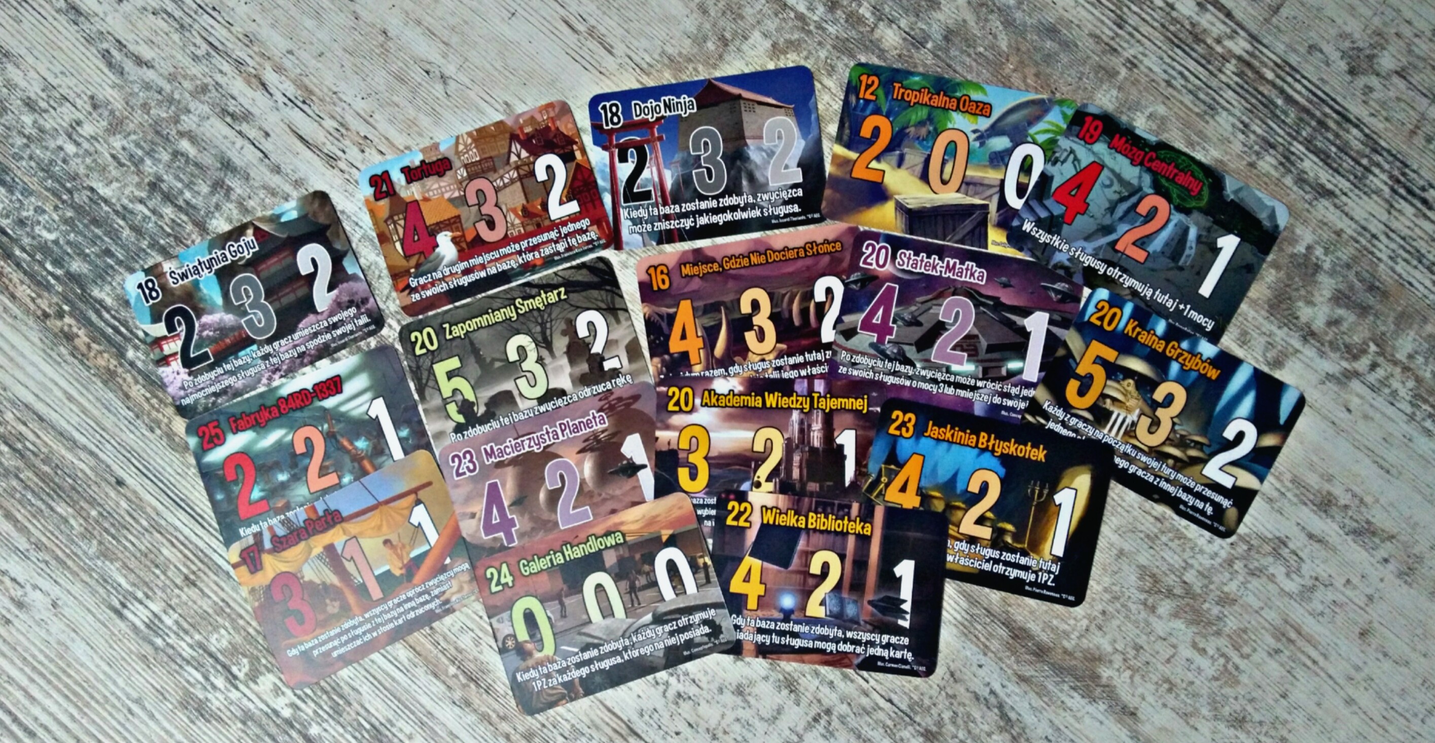 Co takiego dostajemy więc do ręki wraz z niewielkim pudełkiem o adekwatnej co do zawartości, szalonej okładce? Podstawka oferuje nam aż sto siedemdziesiąt sześć kart, na które składa się sto sześćdziesiąt kart frakcji (po dwadzieścia na każdą z ośmiu drużyn) oraz szesnaście kart baz, co razem daje naprawdę sporo możliwości zabawy dla dwóch do czterech graczy. Dysponując jeszcze dodatkiem zyskujemy kolejne cztery frakcje (czyli osiemdziesiąt kart) i osiem kart baz oraz co najciekawsze, zestaw żetonów do podliczania punktów, którego brak w samej podstawce wyjątkowo doskwierał. Dołączone instrukcje są krótkie i zwięzłe, w bardzo przejrzysty sposób tłumaczą zasady trzymając się wszechobecnego w tym tytule humoru. Karty wykonane są z dość cienkiego papieru bez uszlachetnienia, na całe szczęście jednak sztywnego, dzięki czemu przy normalnym traktowaniu i bez zakoszulkowania powinny trochę posłużyć. Natomiast same w sobie karty, są ozdobione grafikami kilku różnych artystów, co niesie za sobą pewną niekonsekwencje stylu, lecz w ogólnym rozrachunku szata graficzna prezentuje się wyjątkowo oryginalnie i doskonale pasuje do klimatu gry.
