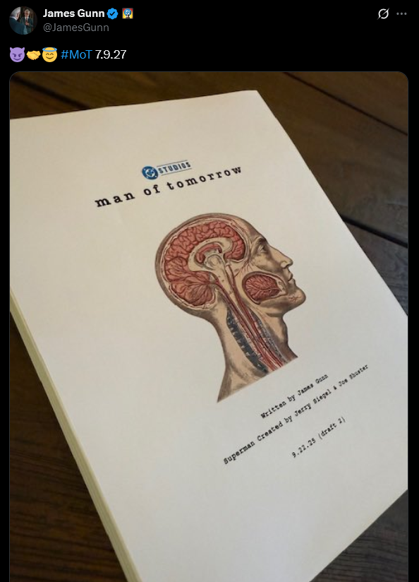 James Gunn ponownie rozpalił spekulacje wokół tego, kto będzie głównym złoczyńcą w nadchodzącym Man of Tomorrow. Reżyser i współszef DC Studios udostępnił w mediach społecznościowych zdjęcie okładki scenariusza filmu, na której widnieje ilustracja ludzkiej głowy z odsłoniętym mózgiem. Fani natychmiast uznali to za sugestię, że do DCU wejdzie Brainiac.