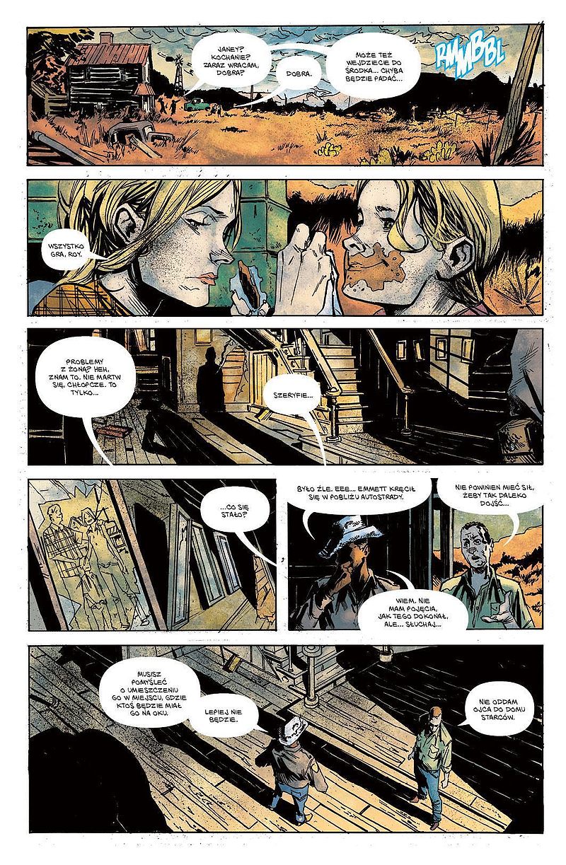 Graficznie mam jedynie problem z „God Country”. Nie ma żadnej tragedii, ilustracje zgrabnie działają w opowiadaniu tej historii. Są wystarczająco ekspresywne, czasem niewyraźne celowo, a rzadziej zupełnie niepotrzebnie. Niektóre sceny Geoff Shaw szkicował jakby od niechcenia, niechlujnie i mało wyraziście, ale zdarzają się u niego bardzo dobre momenty. Jednak w porównaniu z tym, co czyni Cates scenariuszowo, warstwa obrazowa wypada tylko poprawnie.