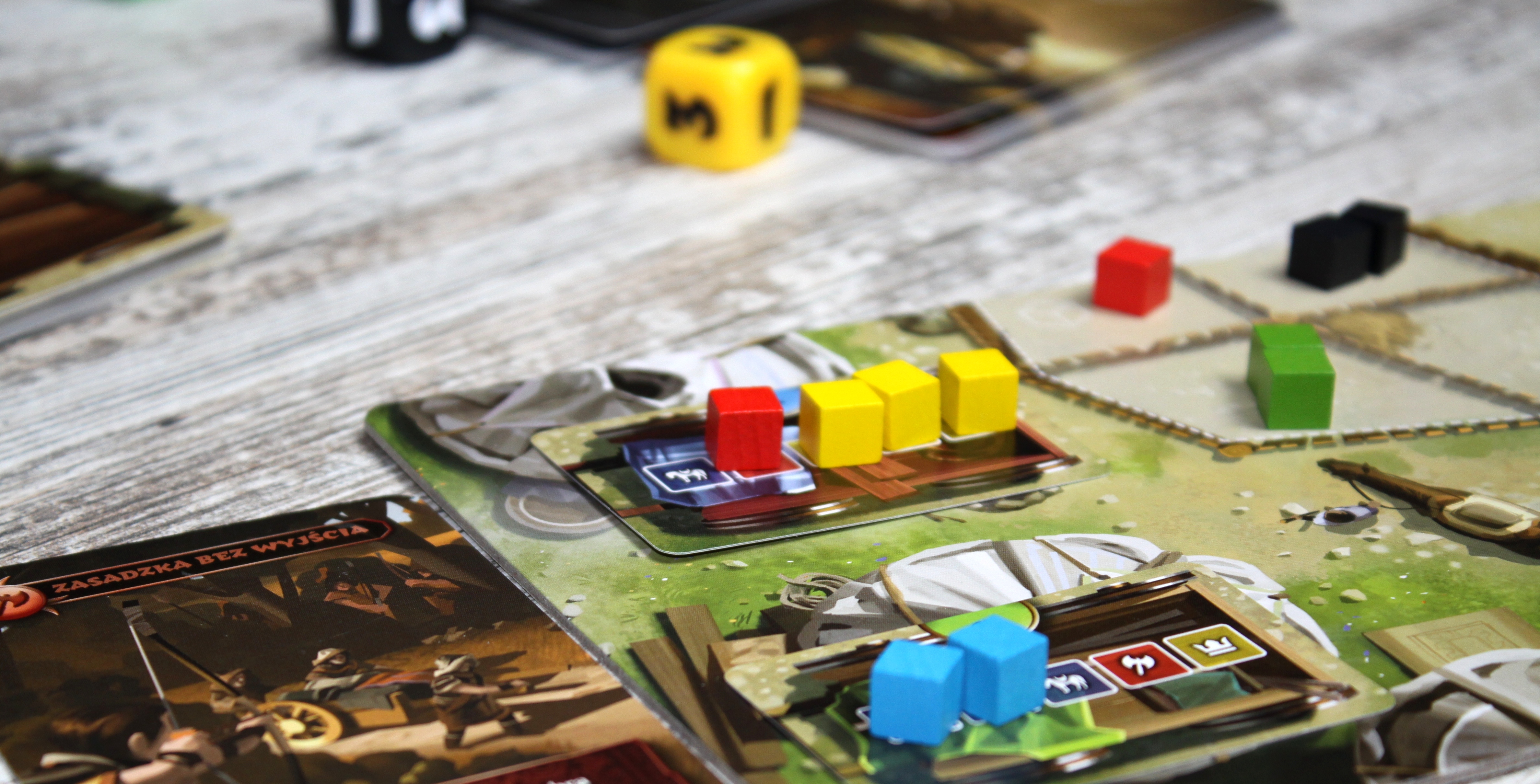 Gra znajduje się w kwadratowym pudełku standardowej jakości z wyjątkowo dobrze zaprojektowaną plastikową wypraską, idealnie segregująca wszystkie elementy i bez problemu mieszczącą karty w koszulkach. Wspomnianych kart natomiast wcale nie jest mało, gdyż dostajemy ich aż dziewięćdziesiąt sześć, z czego cztery to karty pomocy, sześćdziesiąt cztery to talie dobierania (podzielone na wyposażenie, najazdy, najemników, klątwy i skarby), a trzydzieści dwie to trochę mniejsze karty wozów. Oprócz tego mamy do dyspozycji cztery solidne, tekturowe plansze graczy, pięć kolorowych kości, sto dwadzieścia drewnianych znaczników dóbr w pięciu kolorach oraz żeton pierwszego gracza i instrukcję wraz z listą FAQ. Wszystkie wymienione komponenty są wysokiej jakości oraz opatrzone zostały naprawdę wspaniałymi ilustracjami, a na szczególną uwagę i pochwałę zasługują tutaj rewersy talii kart, które odpowiednio ułożone przedstawiają jeden spójny obrazek.