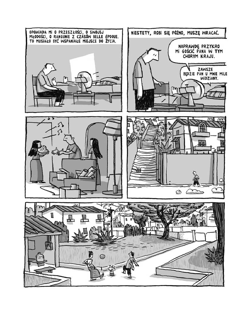 Ujmuje także styl graficzny. Czytelny, prosty, często karykaturalny, przerysowany, wręcz satyryczny, a przy tym nie tracący sensu i merytorycznego podejścia do narracji wizualnej. Czarno-biały, czasem z pewnym akcentem, ale zawsze wyraźnie twórczo Delisle’owy. Sięgając zarówno po jeden, jak i po drugi nie mam wątpliwości, kto stoi za tymi rysunkami.
