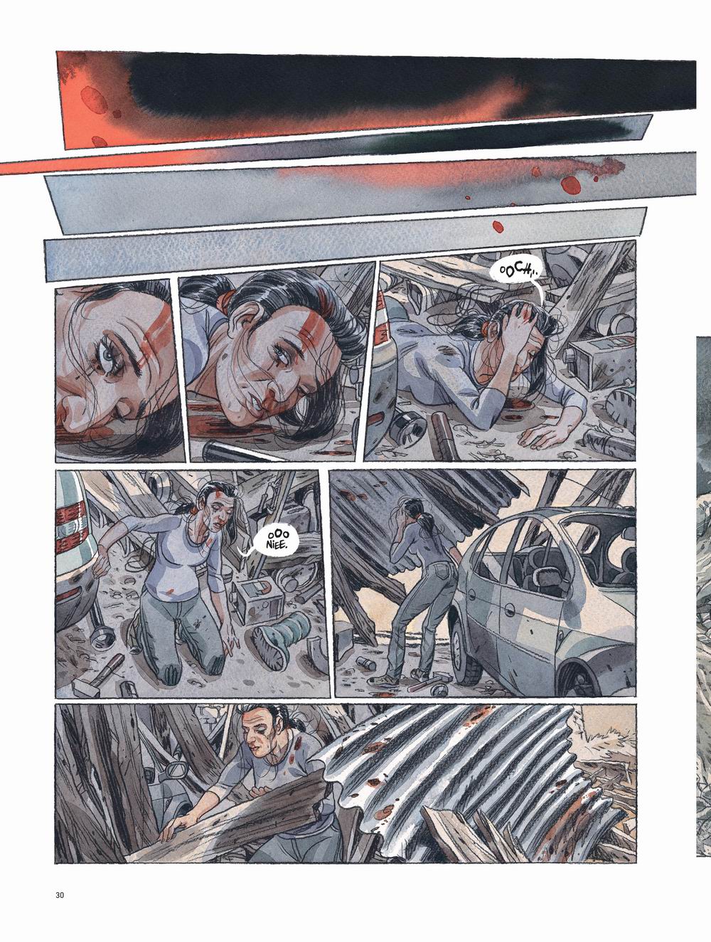 Wprawdzie czytelnik nie dostaje odpowiedzi na te pytanie (w tym tomie), ale zdaje sobie sprawę, co kryje się za rogiem – w wielkim świecie, do którego podążają uziemieni na prowincji bohaterowie. Wiemy, co ich tam czeka, widzieliśmy to w szeregu innych tytułów gatunkowych, domyślamy się, czego wkrótce doświadczą i obserwujemy jak powoli nadzieja gaśnie w matce, choć dzieci wciąż wierzą, a ona nie chce ich złamać. Zestawienie optyki widzącej beznadziejność, koniec i rychłe okrucieństwo matki oraz dzieci, które postrzegają to jako incydent, problem, który minie, gdy tylko znajdą się w objęciach ojca i młodej macochy wydaje się ciekawym pomysłem, dość oryginalnym podejściem do tak mocno wyeksploatowanej konwencji – w niektórych momentach widać także pewne nawiązania do „Drogi” Cormaca McCarthy’ego, lecz Jean-Christophe Chauzy idzie zupełnie inną drogą.