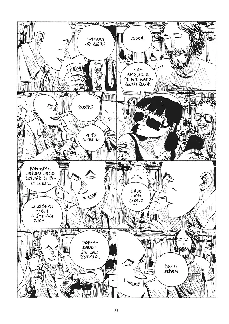 Narracyjnie Stacy to dzieło duszne i klaustrofobiczne. Osiem ciasnych kadrów na stronę, obsesyjna rytmiczność, niemal całkowity brak barw. W tej formule nie ma miejsca na oddech. Każdy panel to albo monolog, albo zbliżenie na pogrążonego w destrukcji bohatera, który dryfuje po własnej głowie jak po zalanej piwnicy. Gipi konsekwentnie odbiera czytelnikowi komfort i nie jest to zabieg estetyczny, lecz świadome podważenie konwencji empatii. Stacy nie ma nam się podobać. Ma nas uwierać.